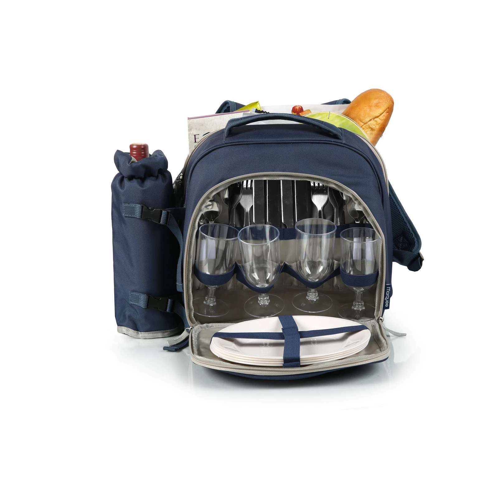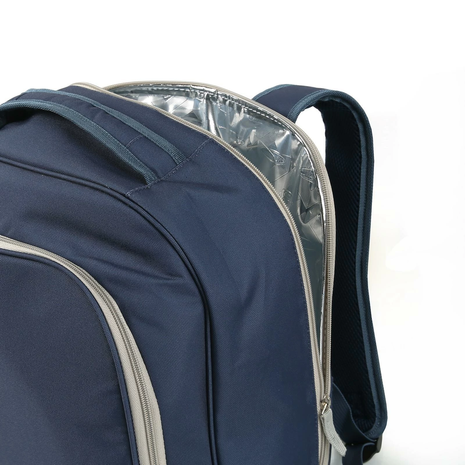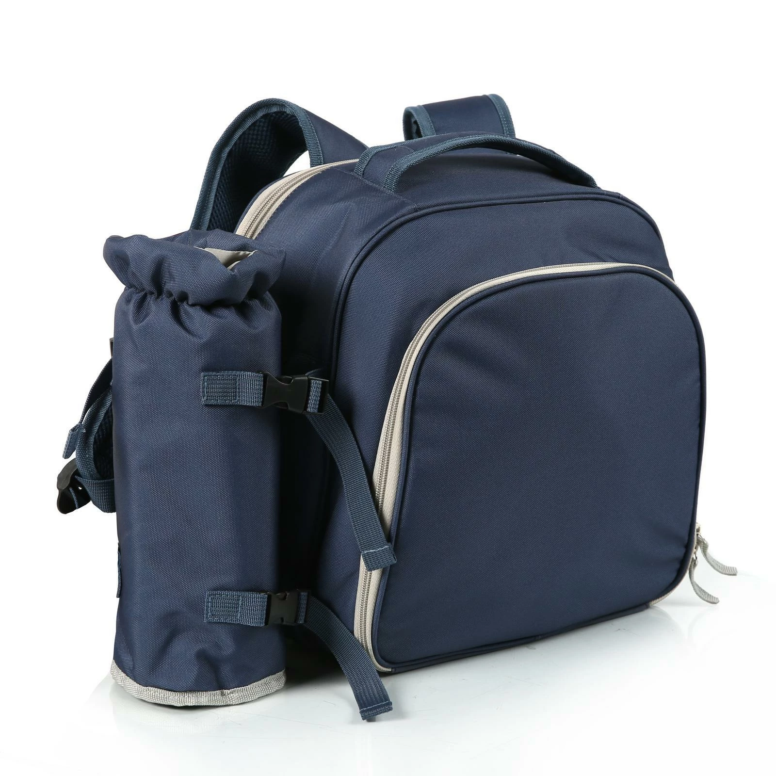 The Marquee High density thermal insulation is perfect for the weekend picnic or sporting event. The padded carry handle makes it nicer to carry to places.The ultra safe easy clean, Therma-Flect lining with Microban means everything stays germ free.Front zippered compartment includes: 4 white plates, 4 knives, 4 forks, 4 spoons, 4 glasses, 1 wine opener (very important).Main compartment has a front zippered pocket which allows storing items safely.Detachable bottle holder with release clips makes storing this easier and neater.Bottle holder has drawstring closure. There is velcro down side of bag & bottle holder for extra stability.Padded shoulder straps makes carry this bag hands free and comfortable.